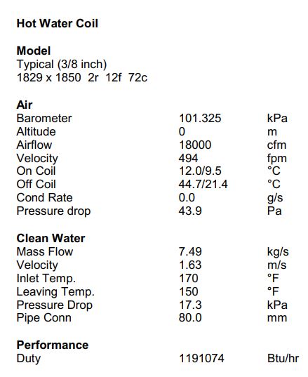 در تصویر زیر خروجی محاسبات مربوط به کویل گرمایشی مطابق با شرایط استاندارد قابل مشاهده است.