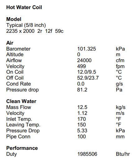 در تصویر زیر خروجی محاسبات مربوط به کویل گرمایشی مطابق با شرایط استاندارد قابل مشاهده است.