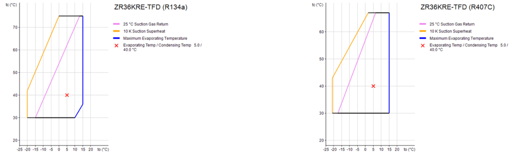 نمودار بازه دمایی کمپرسور با مبردهایی که در نرم افزار کوپلند قابلیت کارکرد دارد در زیر آمده است.